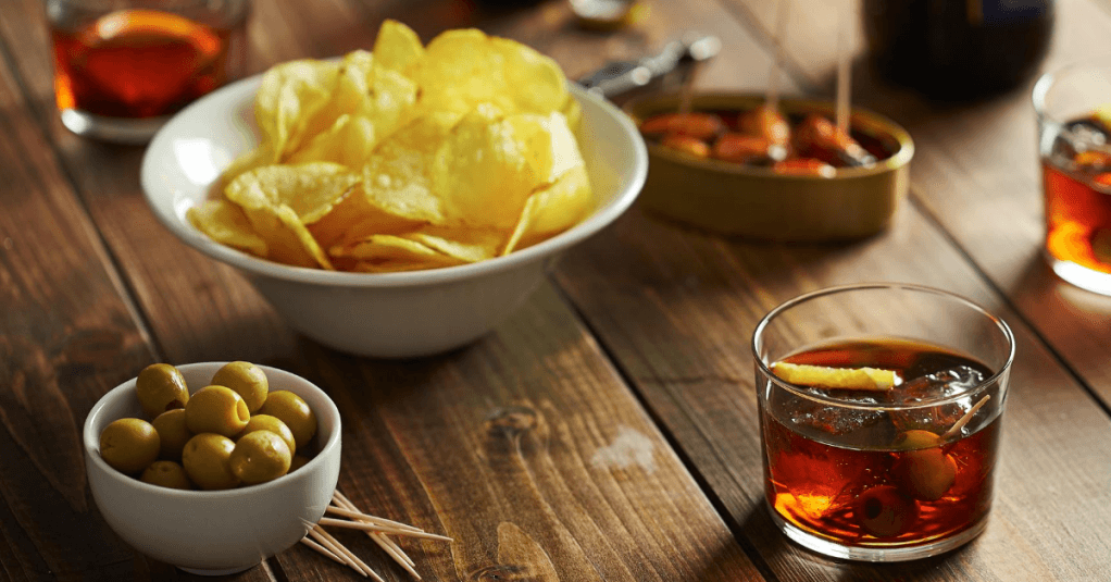 4. Acompanya el vermut amb alguna cosa per picar. És l’hora de fer l’aperitiu i sempre és millor beure’l amb companyia d’un mos, com ara unes olives o unes patates xips.